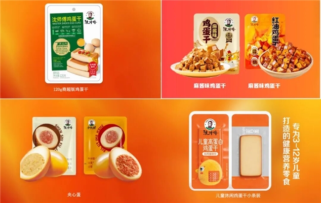 沈师傅儿童鸡蛋干:无添加防腐剂,采用高蛋白配方和萌趣卡通包装,专为3-12岁儿童设计,解决儿童不爱吃蛋黄、挑食的痛点,这正是品牌创始人沈国平老先生创业的初心延续。
